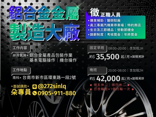 推推✨客TA⭐台南/新市/安定⭐【鋁合金屬製造大廠】⭕無經驗可⭕做四休二⭕錄取即正職-TA
