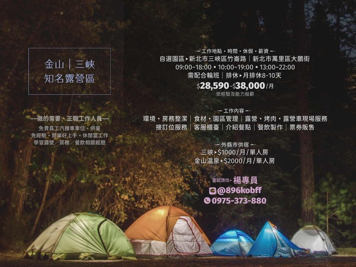 推推✨【新北金山/三峽】露營區工作者⮞揮別乏味工廠⮞吸取戶外芬多精⮞自選園區⮞歡迎熱愛戶外的你⮞供食