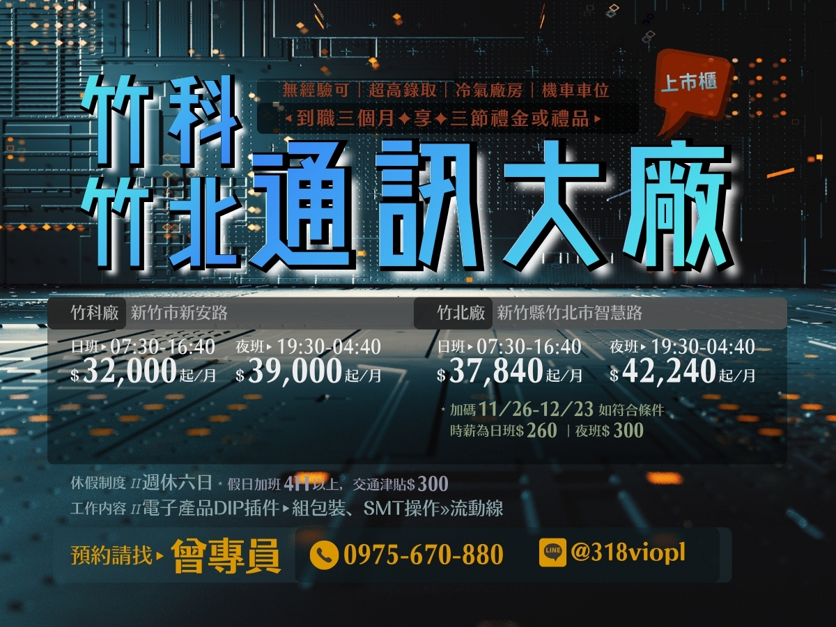 ✅提供宿舍✅公司供餐✅久任獎金$15000✅高時薪240/H
