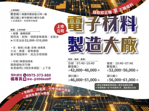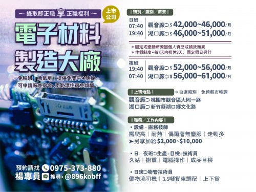 【觀音廠】桃園市觀音區大同一路.【湖口廠】新竹縣湖口鄉文化路月薪 $42,000至61,000元