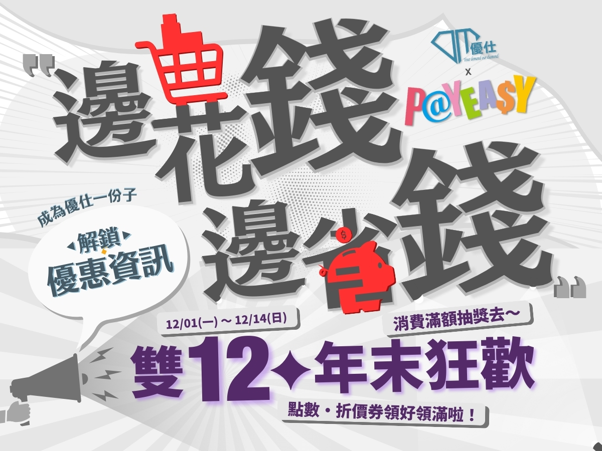 ◤PayEasy 雙12年末狂歡!◢ 這次在活動開始前➤搶先曝光! ✦活動期間:12/01(一) - 12/14(日) ▸每天12:00登入➤最高抽$120福利點數! ▸消費滿6仟▸福利點數3%回饋! ▸全站活動最高回饋 28%! ▸消費滿3仟▸抽福利點數 $100! ▸消費滿3萬▸最大獎抽鑽石項鍊! ▸領取折價券最高再省 $570! ▸每天還有開寶箱遊戲,最高可抽$