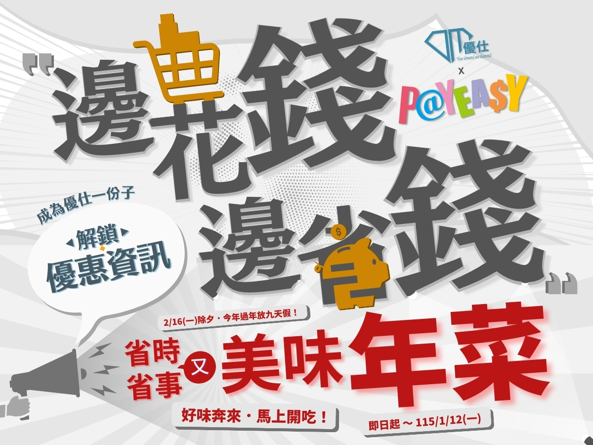 【優仕x PayEasy】快過年囉!省時又省事的美味年 菜買起來! 可能還有人不知道115年的農曆過年是甚麼時候,這邊先提醒大家! 2/14 (六)-2/22 (日) ▸長達九天的新年假期來囉! 2/16 (一) 這天就是除夕,早早備好年菜就不擔心沒有好料吃啦! PayEasy 近期推出年菜特輯—好味奔來.馬上開吃!精選年菜5折起! 2 張藍色小朋友有找的年菜組合