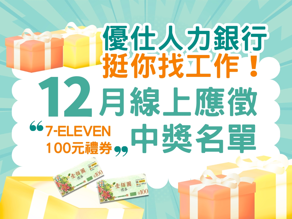 ⋱⋱ 12月線上應徵✦中獎名單✦ ⋰⋰ ◤恭喜這10位幸運得獎者◢ ⁌▪獲得#7eleven禮券100元▪⁍ ⋆✦⋆求職者們請注意⋆✦⋆ #優仕人力銀行不只挺您找工作 ⠺還給您小確幸⠗ 在優仕人力銀行線上應徵 就有機會抽7-eleven禮券: ❶完成會員註冊 ❷填寫線上履歷表 ❸選擇工作並進行線上應徵 ▾超多熱門#職缺等你來應徵▾ https://www