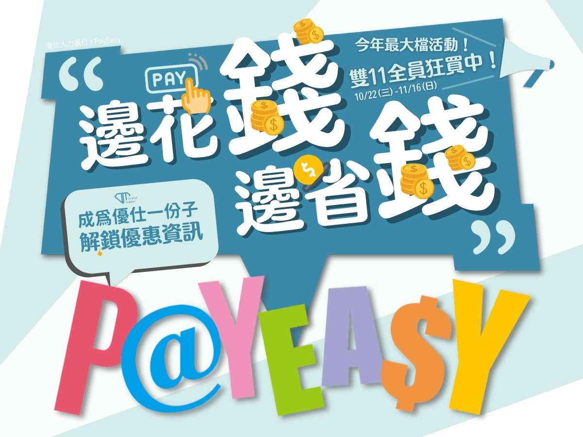 【優仕x PayEasy】年度最大檔─【雙11全員狂買中】上線囉! ◤雙11全員狂買中◢活動上線囉~天天免費抽$1,111福利點數! 活動時間為:10/22(三) - 11/16(日)。 本檔活動集結眾多品牌、特談多樣超殺商品,將好康通通回饋給您!別忘了開啟APP通知,好康不漏接! 消費滿 $10,000 ▸回饋4%福利點數。 滿 $20,000▸抽!$1,500家樂福禮