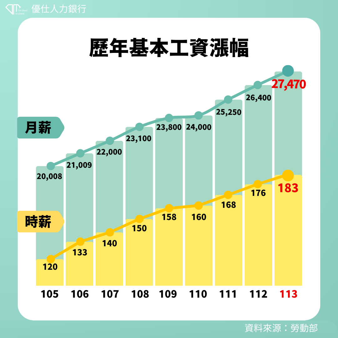 113年1月1日起,基本工資調漲,基本工資月薪由26,400元調整至27,470元,調漲1,070 元,增加4.05%,基本工資時薪由176元調整至183元,增加7元,漲幅為3.97%。